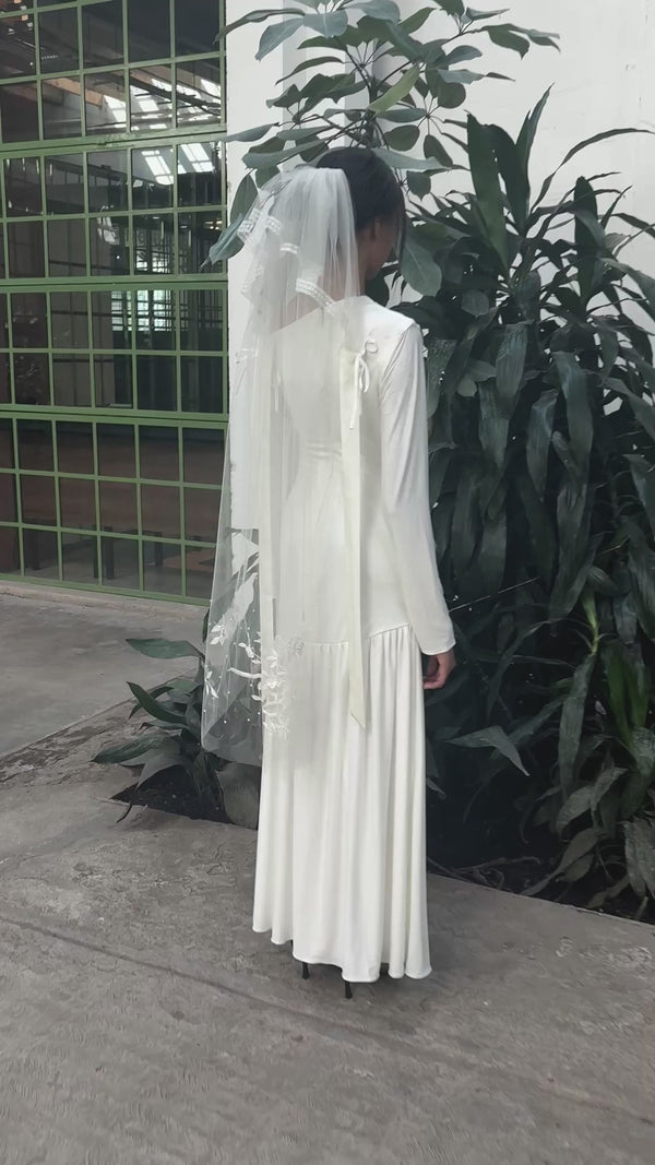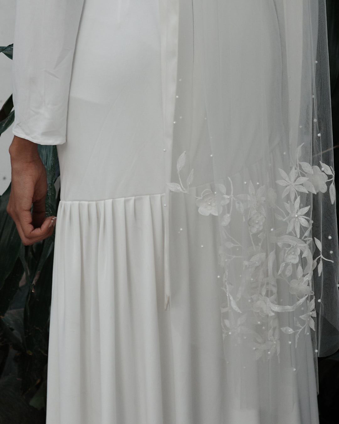 The delicate nature of our veils requires gentle handling. Unfold and hang, steam lightly if needed.Keep away from direct sunlight. Avoid excessive friction to preserve its softness and flowy drape. Do not machine wash or soak in water. Spot clean using a damp cloth. Do not bleach. Unembellished veils may be hand-washed and air-dried flat. Embellished veils could be professional dry-cleaded if needed by a specialized provider using absolutely no liquids in their process.