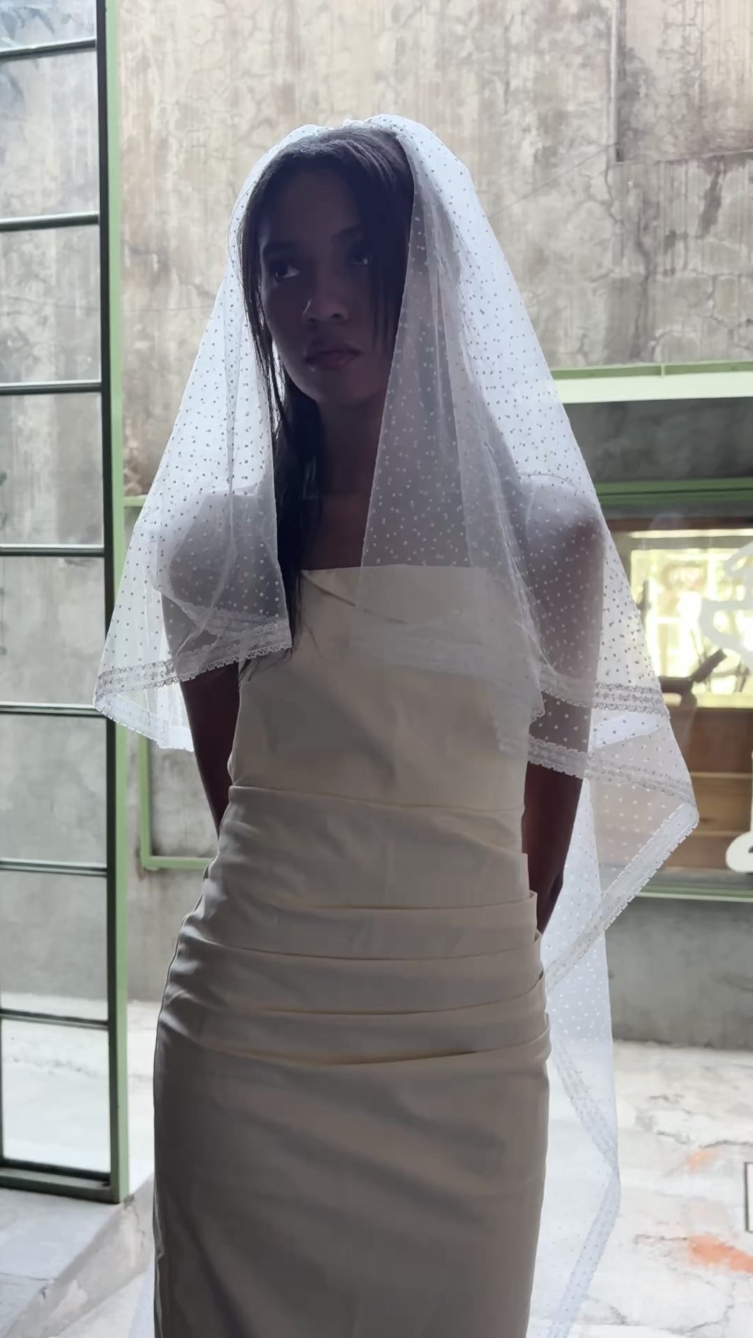 A dreamy ensemble! Soft ivory dotted tulle finished with a delicate lace trim. Comes with a 28" blusher.