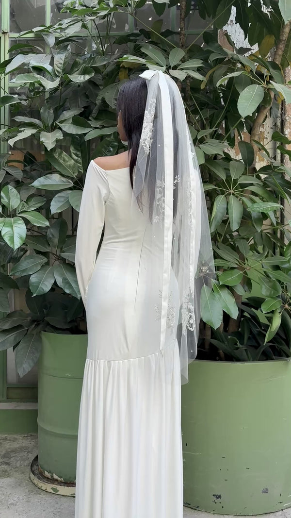 The delicate nature of our veils requires gentle handling. Unfold and hang, steam lightly if needed.Keep away from direct sunlight. Avoid excessive friction to preserve its softness and flowy drape. Do not machine wash or soak in water. Spot clean using a damp cloth. Do not bleach. Unembellished veils may be hand-washed and air-dried flat. Embellished veils could be professional dry-cleaded if needed by a specialized provider using absolutely no liquids in their process.