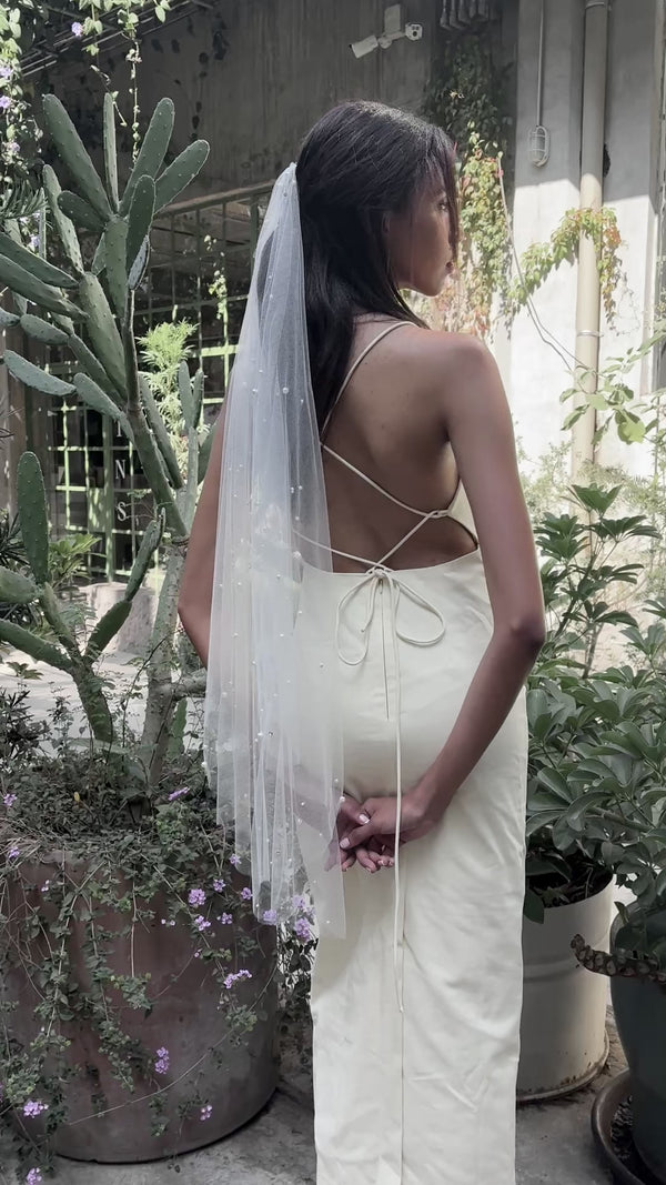 Single tier light, fingertip length Crystals and Pearls veil. Individually sewn. Made with English tulle.