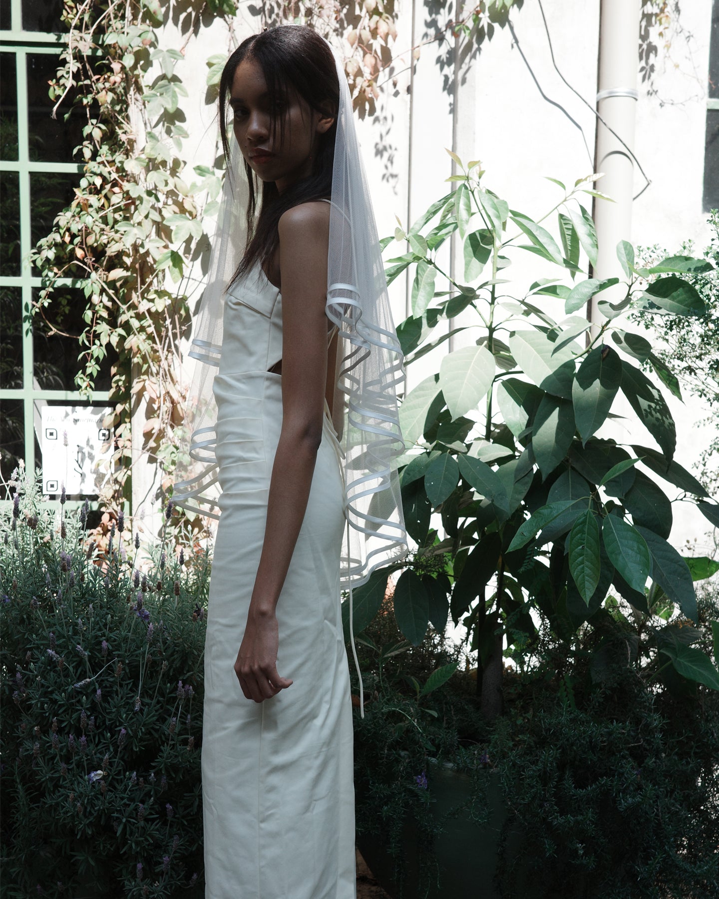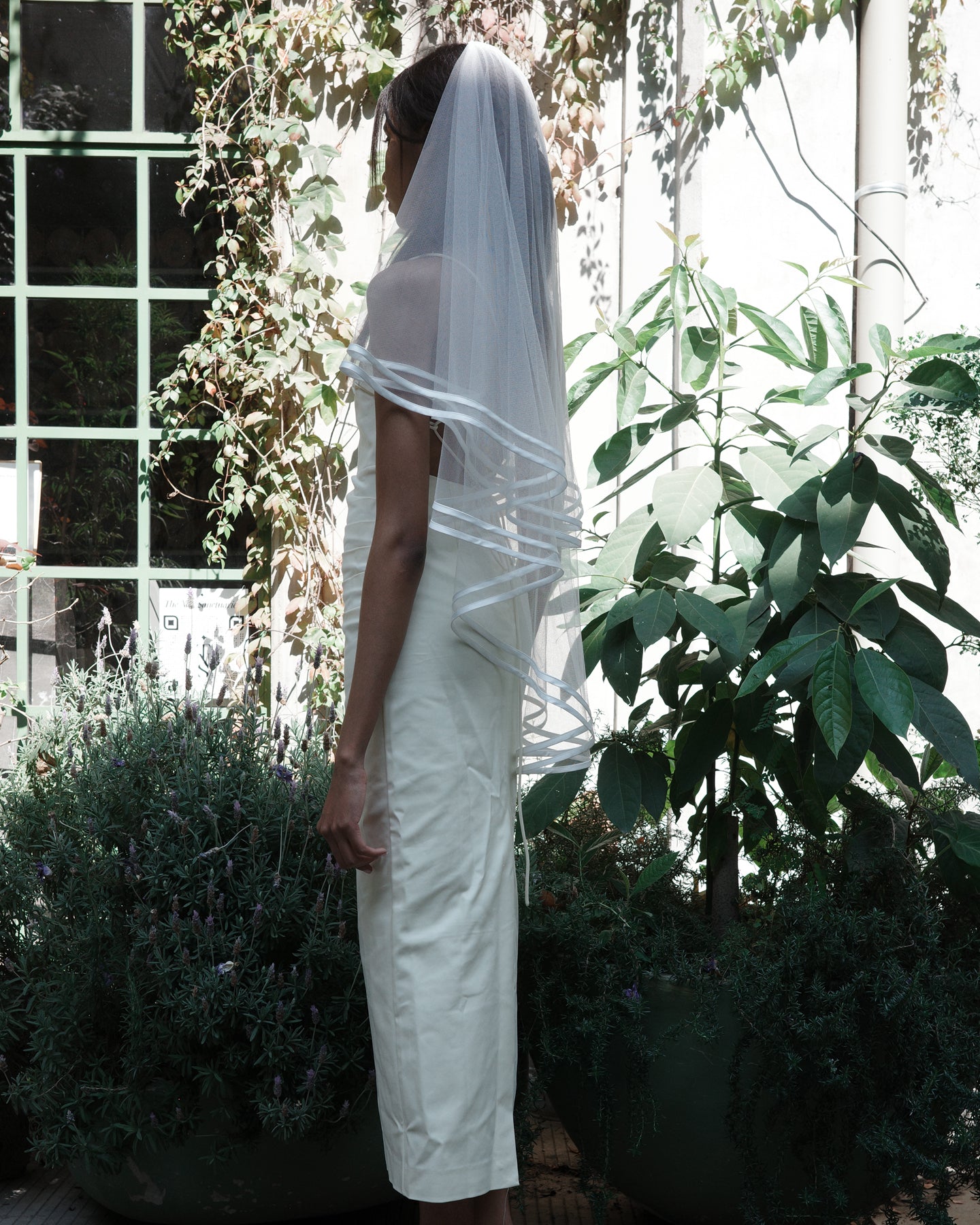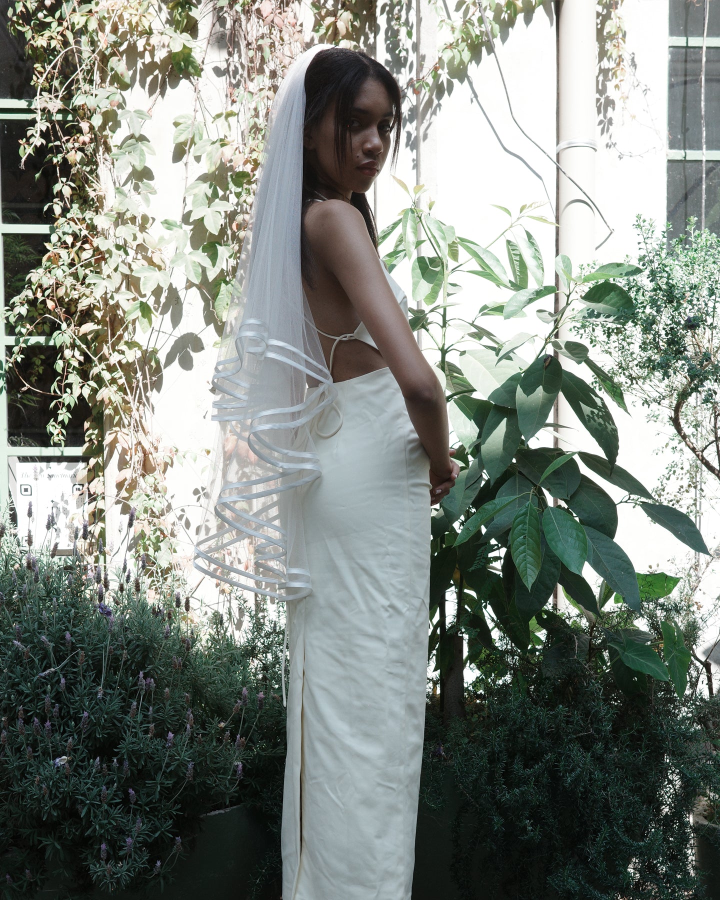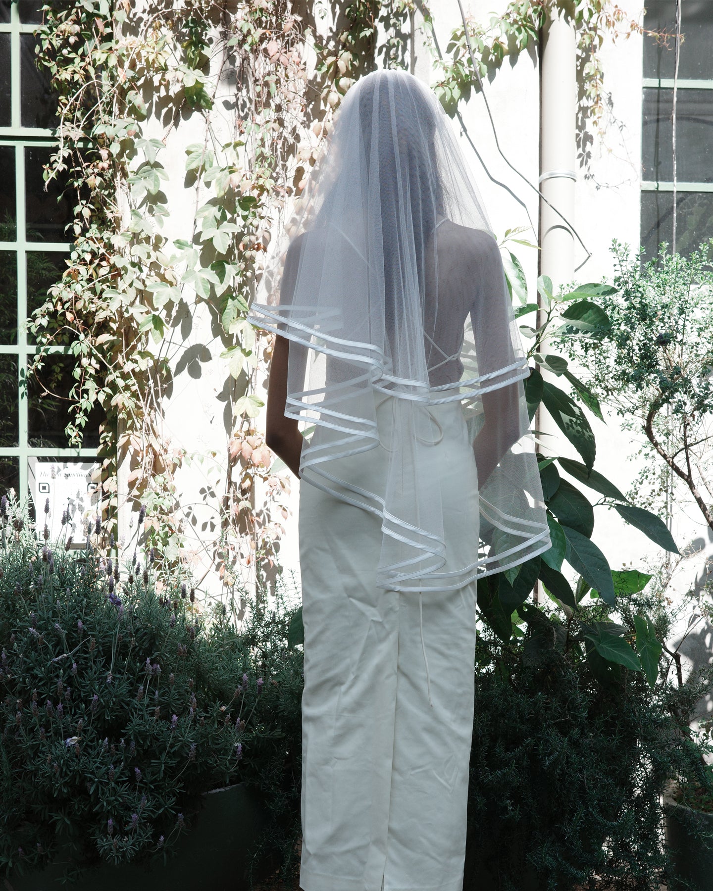 A classic silhouette framed with a soft satin double trim, adding a touch of structure and polish. Finished with a timeless, sophisticated detail. Perfect for the modern bride who values both simplicity and grace.