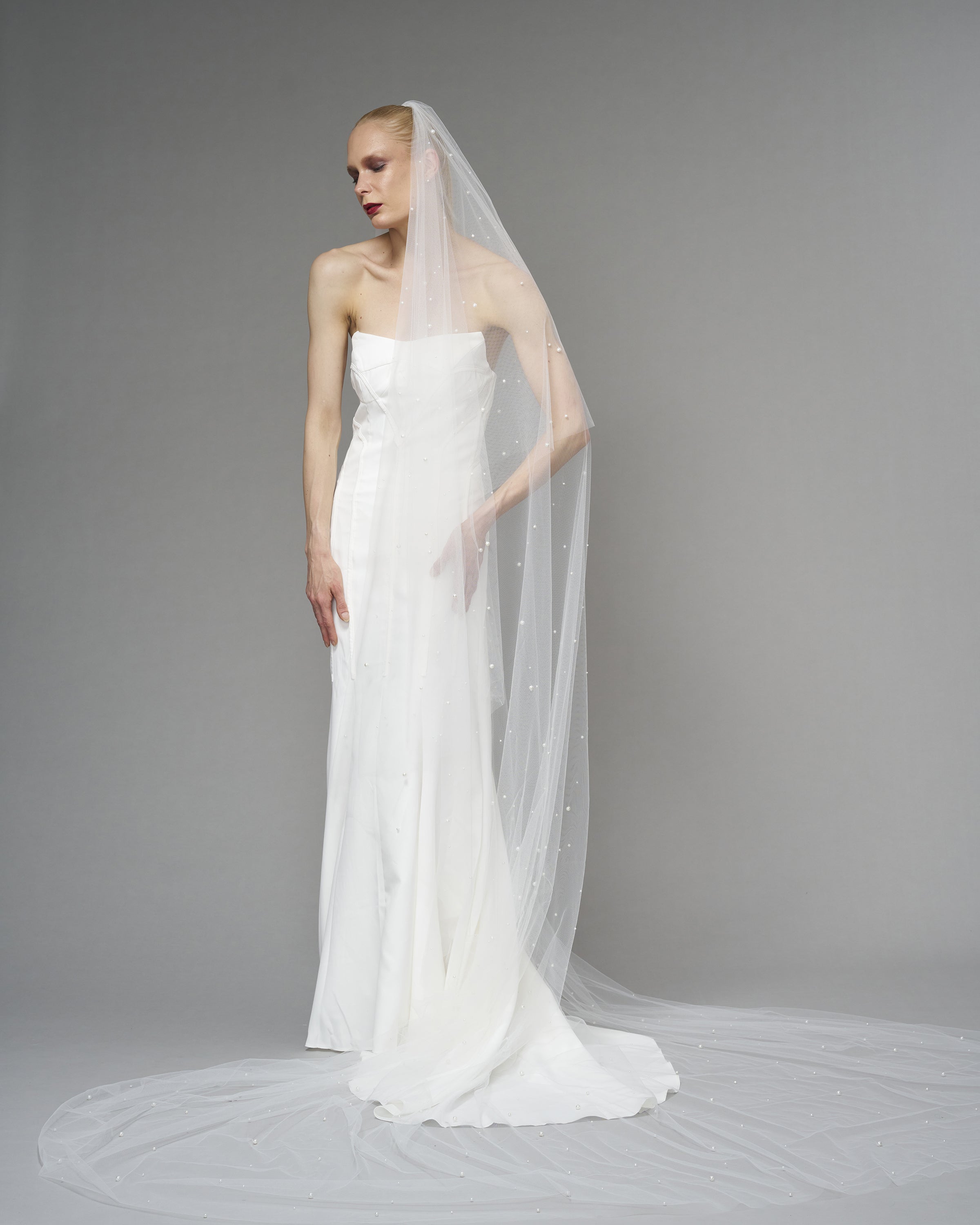 A timeless balance of simplicity and refinement. Delicately adorned with scattered, individually sewn, multi-sized glass pearls, catching light with subtle elegance—an understated yet luminous detail for the modern bride.