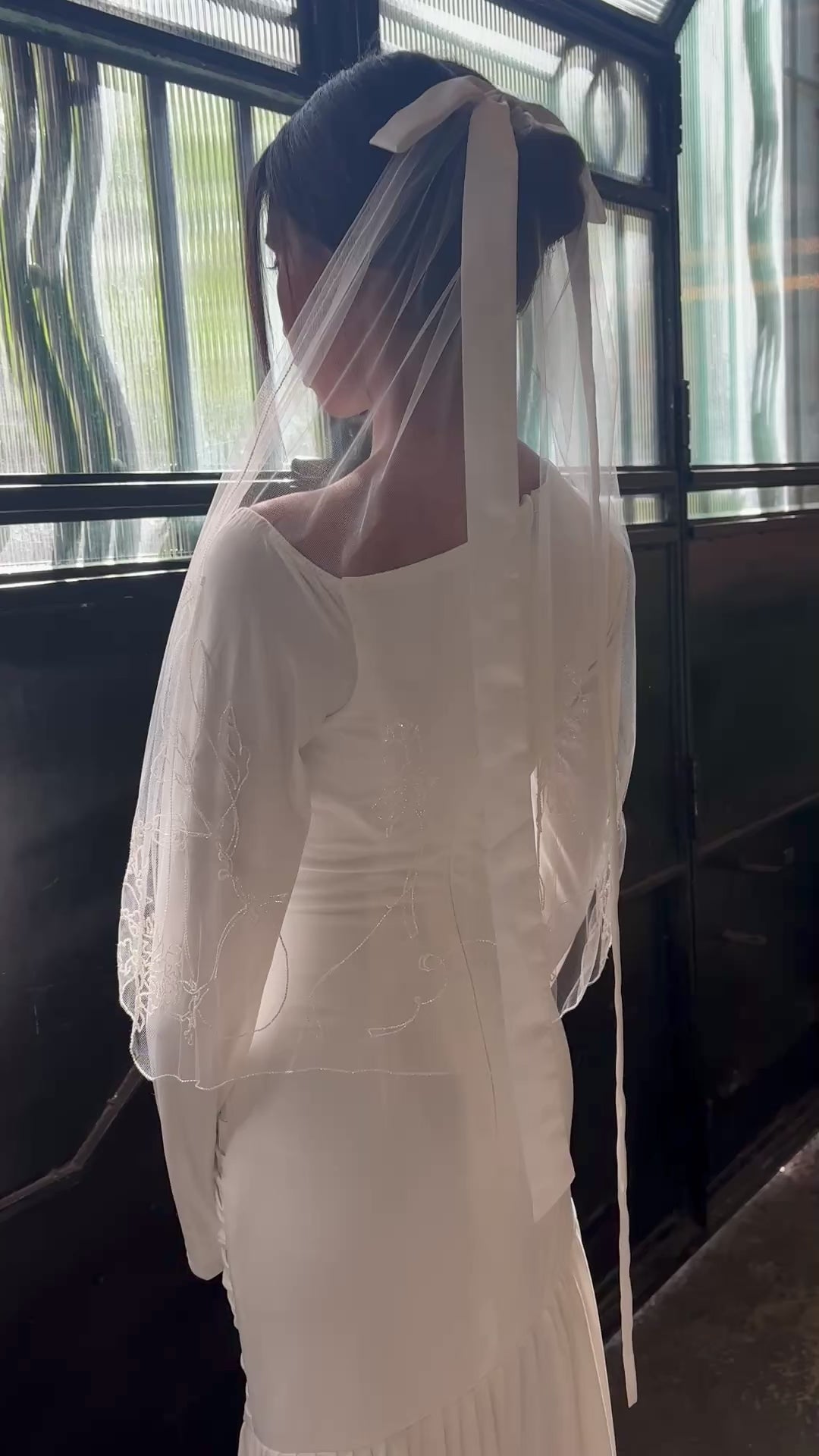 Elbow length veil embellished with floral motifs, beaded with glass beads and finished with a soft satin bow.