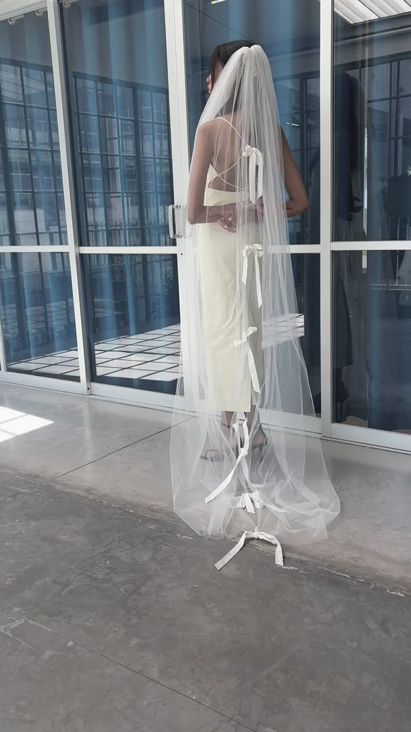 A soft English tulle veil, open in the middle, attached by delicate satin strings tied into beautiful bows.