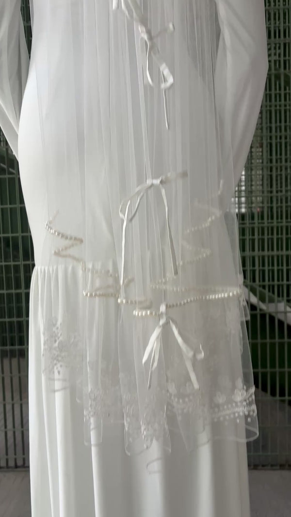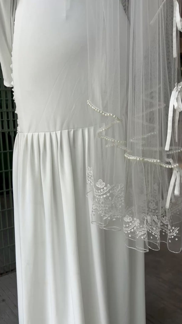 Ornamental embroidery and pearls make this unique veil. Cut in the middle, attached by satin ties made into beautiful bows.
