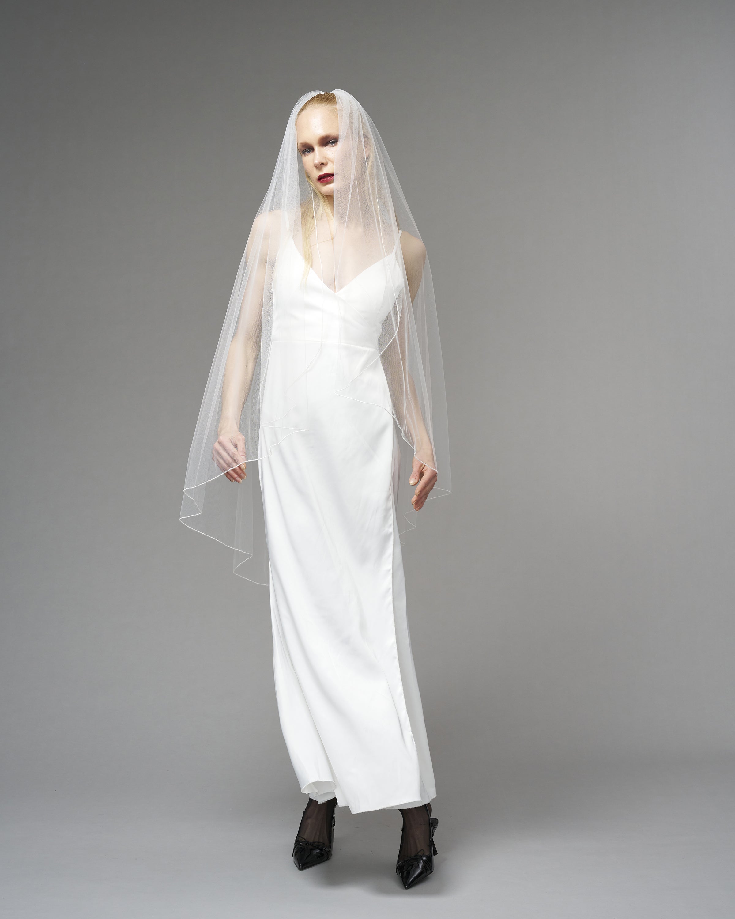 Ethereal and effortless. A delicate edge of glass seed beads sewn into this veil, adding a subtle shimmer, catching the light with every step. An understated yet intricate detail for the modern bride who appreciates quiet elegance.