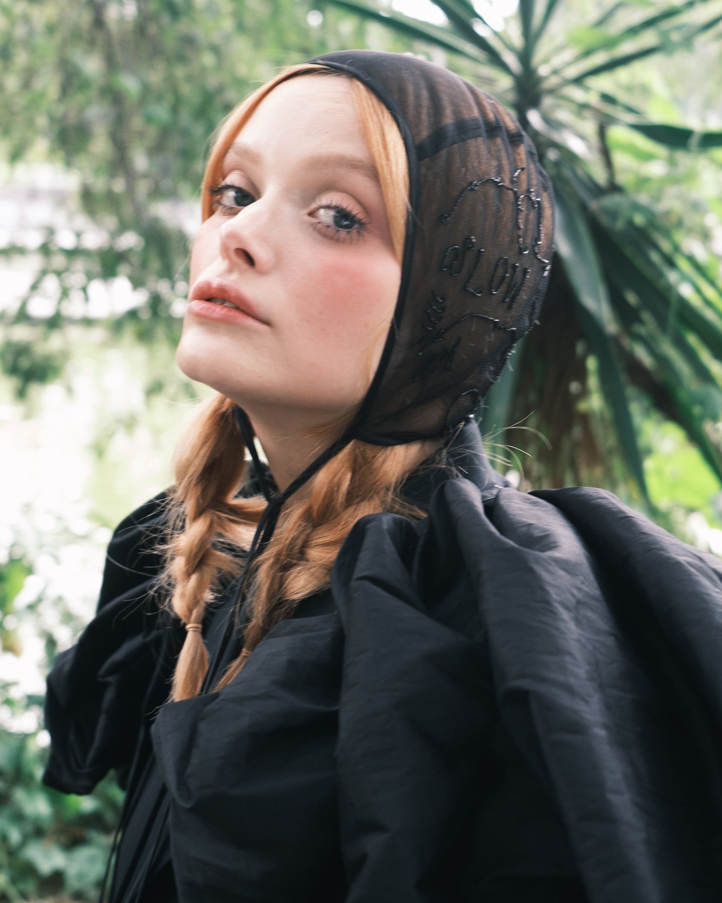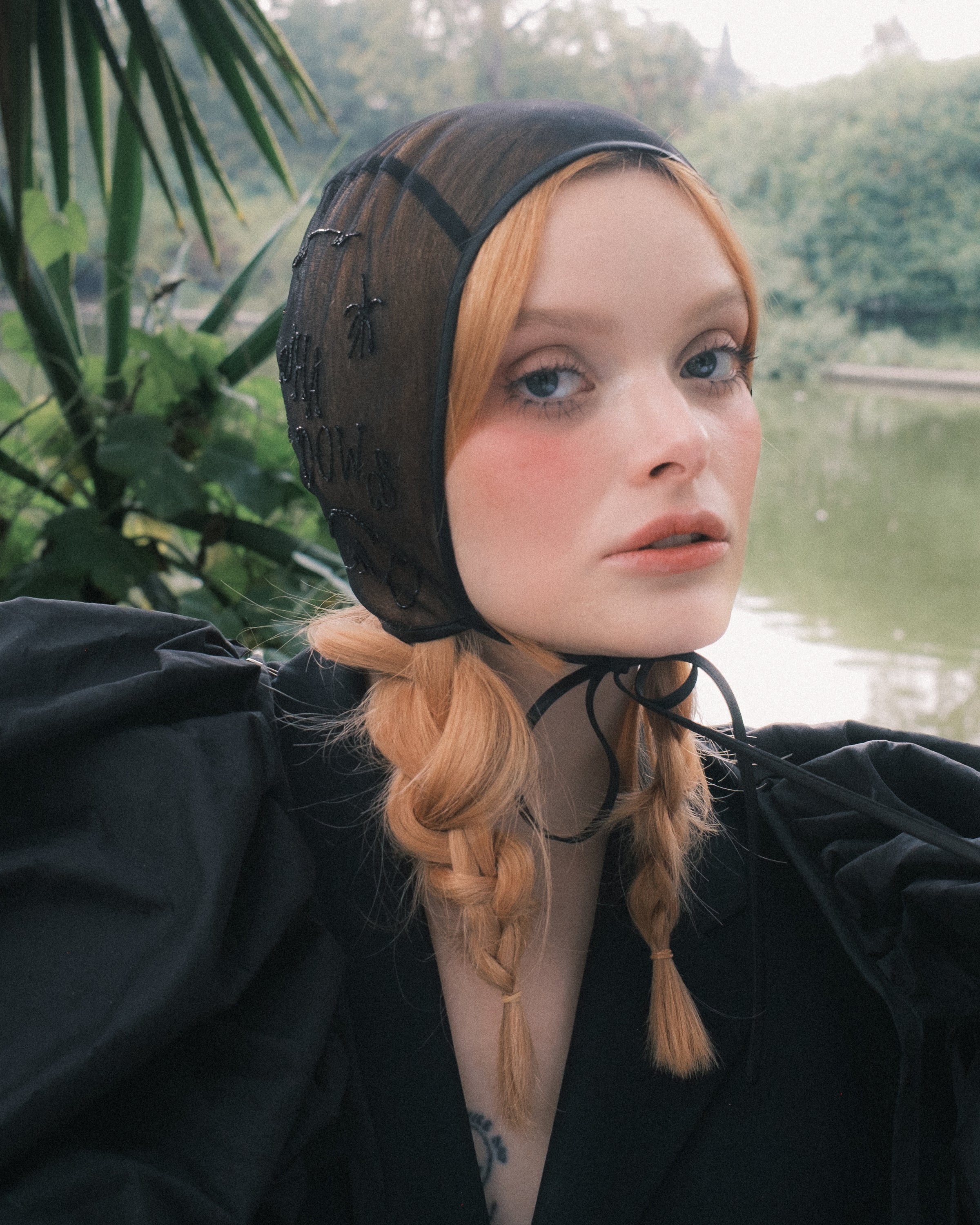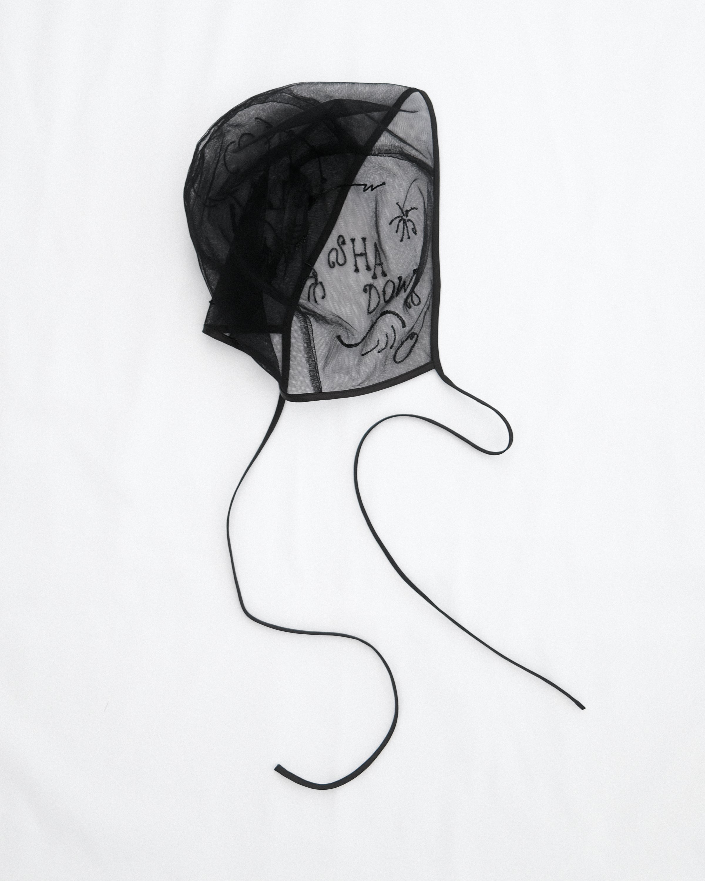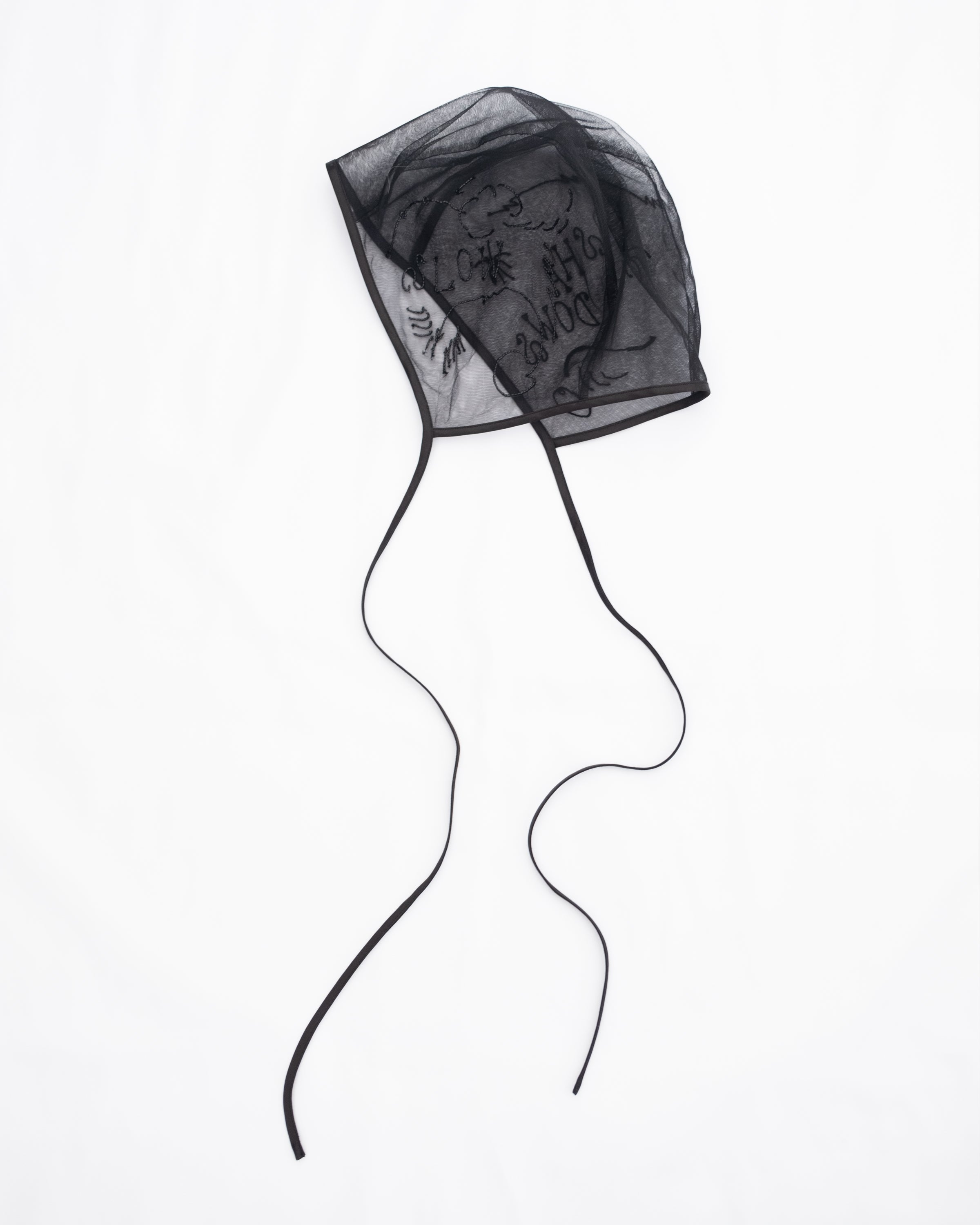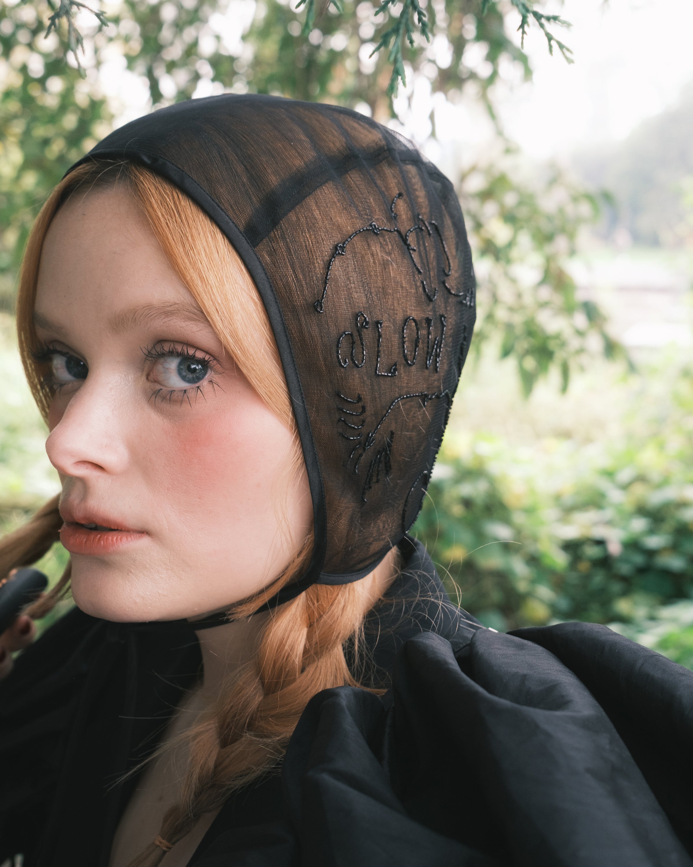 From our collaboration with Jackie Crespo, a luminous black bonnet, where black glass seed beads trace words across a veil of soft black mesh.