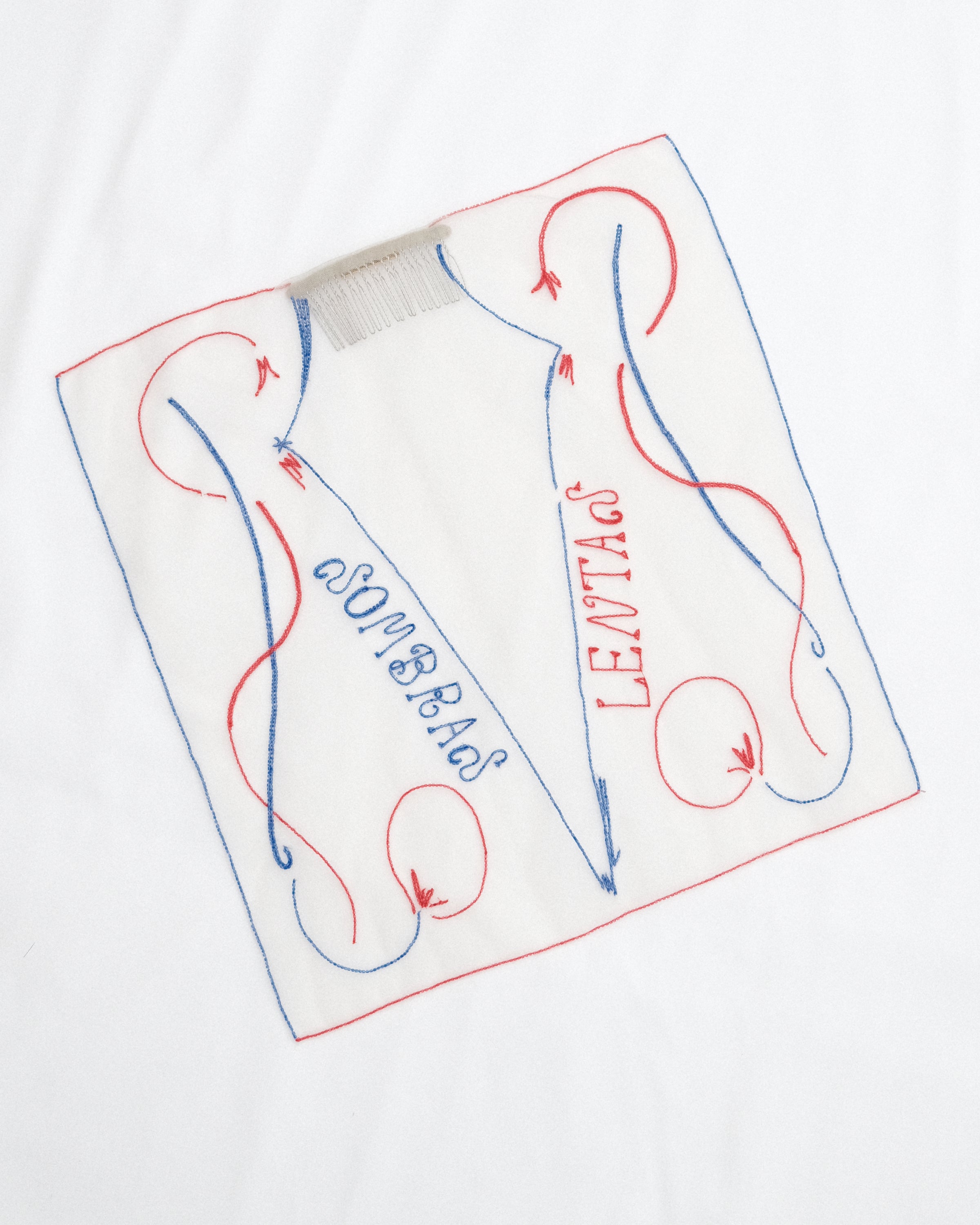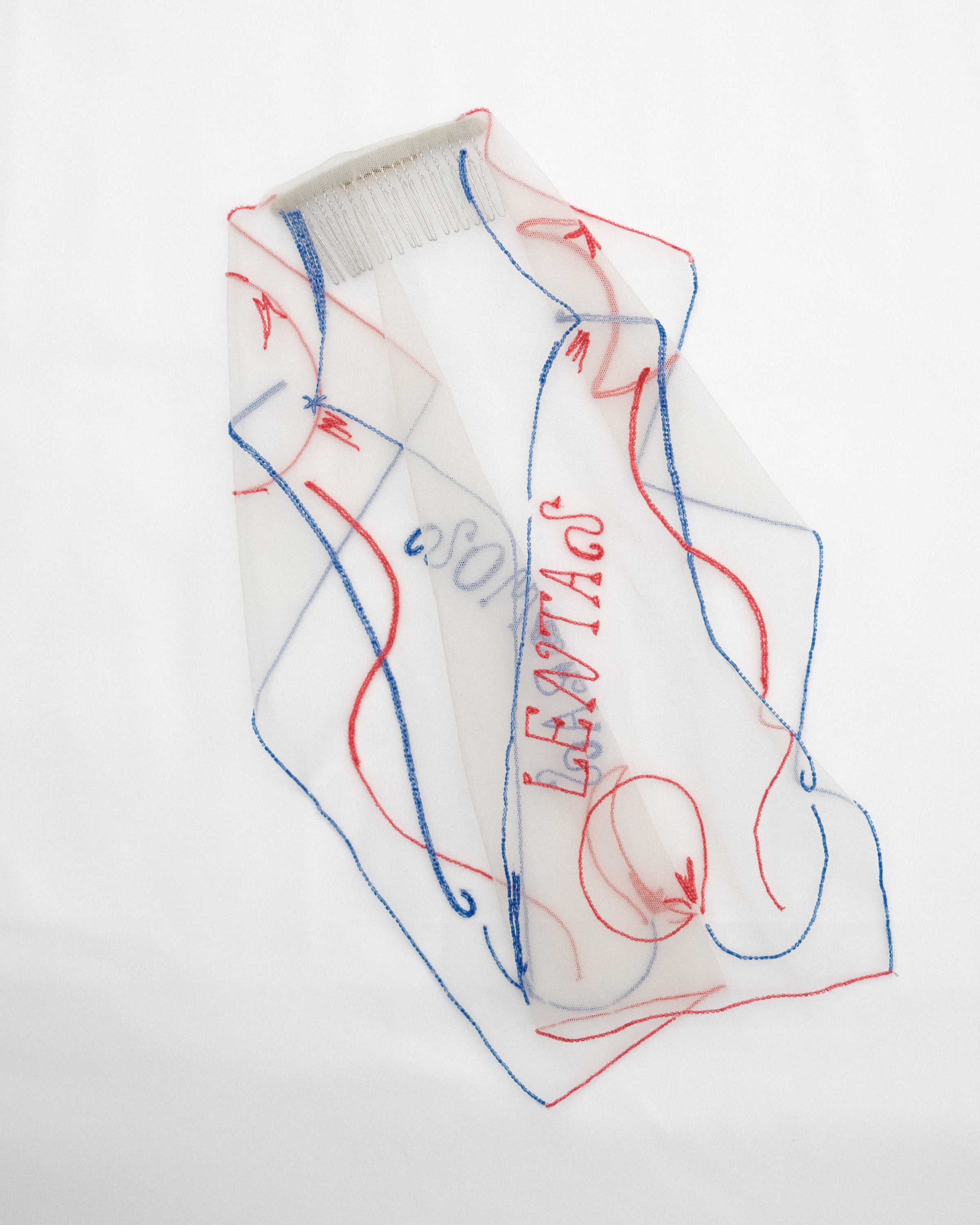 From our collaboration with Jackie Crespo, a soft gray mini veil, delicately hand-beaded with red and blue glass beads shimmering across fine hand-dyed mesh.