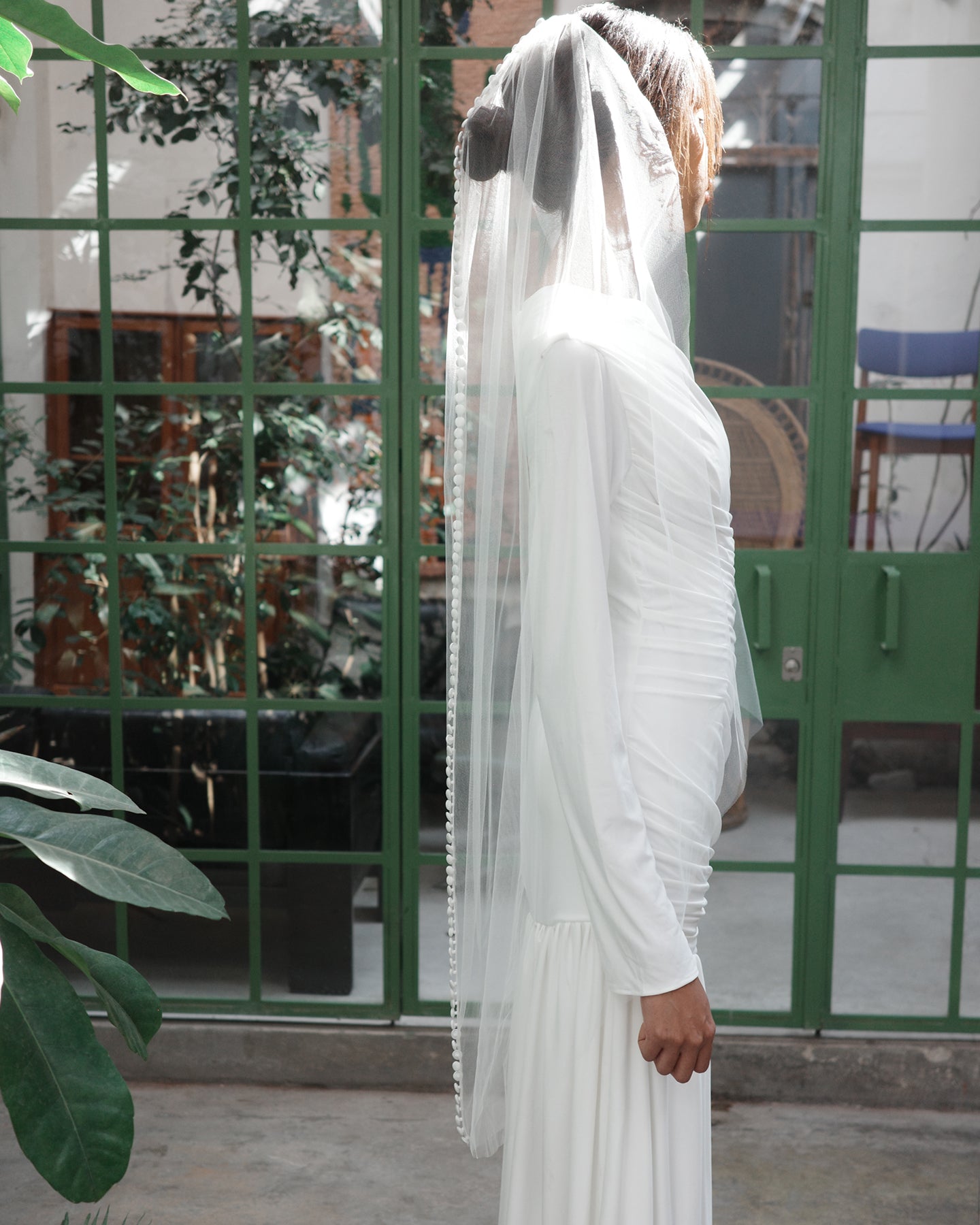 A path of satin covered buttons at the centre of an English tulle veil symbolizing a sacred union.